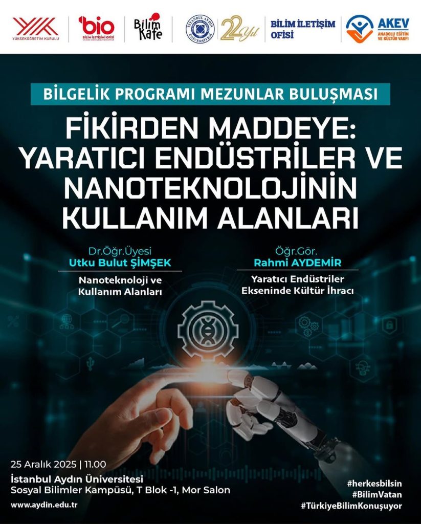 Bilgelik Programı Mezunlar Buluşması kapsamında düzenlenen “Fikirden Maddeye: Yaratıcı Endüstriler ve Nanoteknolojinin Kullanım Alanları” başlıklı etkinlik, 25 Aralık 2025 tarihinde İstanbul Aydın Üniversitesi Sosyal Bilimler Kampüsü’nde gerçekleştirildi.